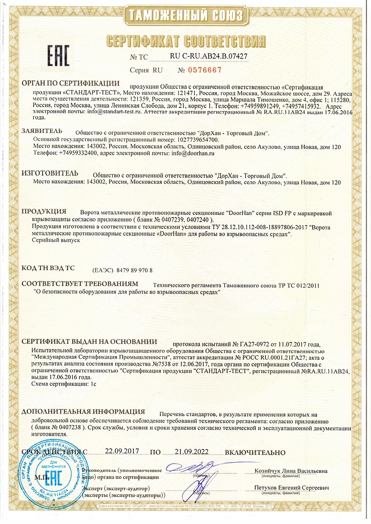 Сертификат соответствия на противопожарные секционные ворота Doorhan